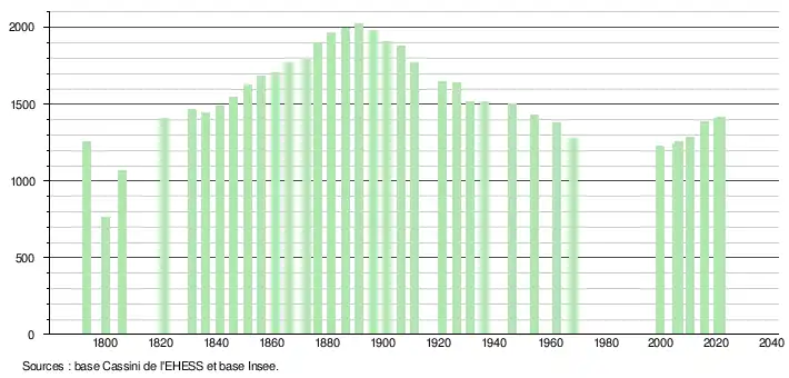 L'évolution du nombre d'habitants est connue à travers les recensements de la population effectués dans la commune depuis 1793. Pour les communes de moins de 10 000 habitants, une enquête de recensement portant sur toute la population est réalisée tous les cinq ans, les populations légales des années intermédiaires étant quant à elles estimées par interpolation ou extrapolation[25]. Pour la commune, le premier recensement exhaustif entrant dans le cadre du nouveau dispositif a été réalisé en 2005[26].