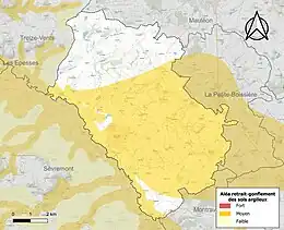 Les mouvements de terrains susceptibles de se produire sur la commune sont des tassements différentiels[17]. Le retrait-gonflement des sols argileux est susceptible d'engendrer des dommages importants aux bâtiments en cas d’alternance de périodes de sécheresse et de pluie[18]. 65,8 % de la superficie communale est en aléa moyen ou fort (54,9 % au niveau départemental et 48,5 % au niveau national)[Carte 2]. Depuis le , en application de la loi ELAN, différentes contraintes s'imposent aux vendeurs, maîtres d'ouvrages ou constructeurs de biens situés dans une zone classée en aléa moyen ou fort[Note 2],[19].