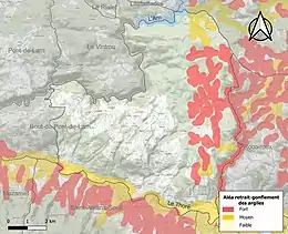 La commune est vulnérable au risque de mouvements de terrains constitué principalement du retrait-gonflement des sols argileux[32]. Cet aléa est susceptible d'engendrer des dommages importants aux bâtiments en cas d’alternance de périodes de sécheresse et de pluie. 22 % de la superficie communale est en aléa moyen ou fort (76,3 % au niveau départemental et 48,5 % au niveau national). Sur les 537 bâtiments dénombrés sur la commune en 2019, 83 sont en aléa moyen ou fort, soit 15 %, à comparer aux 90 % au niveau départemental et 54 % au niveau national. Une cartographie de l'exposition du territoire national au retrait gonflement des sols argileux est disponible sur le site du BRGM[33],[Carte 3].