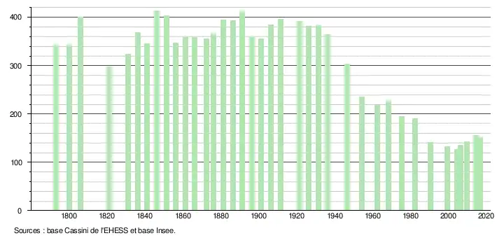 L'évolution du nombre d'habitants est connue à travers les recensements de la population effectués dans la commune depuis 1793. Pour les communes de moins de 10 000 habitants, une enquête de recensement portant sur toute la population est réalisée tous les cinq ans, les populations légales des années intermédiaires étant quant à elles estimées par interpolation ou extrapolation[4]. Pour la commune, le premier recensement exhaustif entrant dans le cadre du nouveau dispositif a été réalisé en 2004[5].