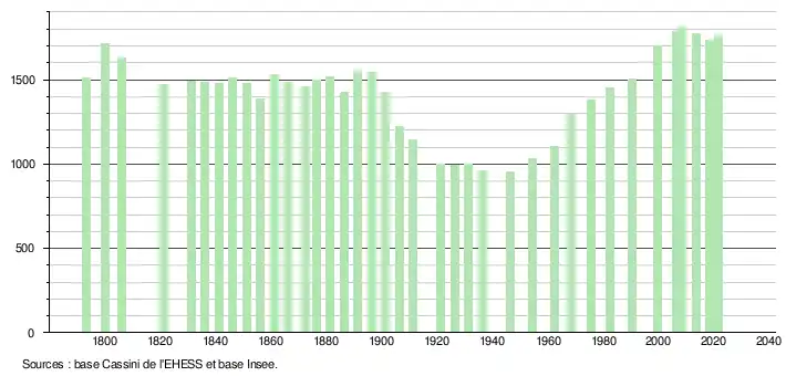 L'évolution du nombre d'habitants est connue à travers les recensements de la population effectués dans la commune depuis 1793. Pour les communes de moins de 10 000 habitants, une enquête de recensement portant sur toute la population est réalisée tous les cinq ans, les populations légales des années intermédiaires étant quant à elles estimées par interpolation ou extrapolation[32]. Pour la commune, le premier recensement exhaustif entrant dans le cadre du nouveau dispositif a été réalisé en 2008[33].