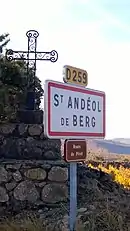 Conformément à la loi, au début de l'année 2013, la municipalité donne un nom et une plaque de signalisation aux routes, rues, impasses et chemins habités de Saint-Andéol-de-Berg et en numérote les maisons. Ainsi, la RD 259, qui traverse de part en part la commune, est baptisée route de Péret, à l'entrée du village (à partir du panneau "Saint-Andéol-de-Berg", de la croix du Clorond et du chemin pierreux des Rouvières), où elle croise le chemin goudronné du Clux (sans plaque car sans habitant) et l'impasse des Mourades, puis rue du Pigeonnier, dans la partie haute du bourg (où elle croise la route de Masgiraud, qui commence à proximité du cimetière, en direction du nord-est, et permet d'atteindre le bois des Pins, l' arbre Ferrat, le quartier de Serrecourt, le Mas Giraud, le Cros de Berg... et Alba-la-Romaine), puis rue du Puits-du-Moine, dans la partie centrale (où elle longe la place de l'Église et croise le chemin des Lauriers, l'impasse de l'Église - qui conduit au sentier du Vallat (en occitan : le viôl[30] du Vallat) - et l'impasse des Prés), puis rue des Pourettes, dans la partie basse (où elle croise le chemin du Lavoir, l'impasse des Fresnes - qui conduit au sentier du Vallat - et l'impasse de Patafla), puis route de Ladou, à la sortie du bourg (croisant le chemin d'Autignas), puis rue de l'Abri-de-la-Fontaine, dans sa traversée du hameau de Ladou (où elle croise les chemins du Merdaric, du Moulin et de l'Arcade), après lequel elle se continue en route de Coussas (croisant l'impasse de Bas-Coussas), avant de se prolonger en un chemin de terre qui permet de rejoindre Valvignères.