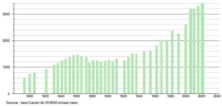 L'évolution du nombre d'habitants est connue à travers les recensements de la population effectués dans la commune depuis 1793. Pour les communes de moins de 10 000 habitants, une enquête de recensement portant sur toute la population est réalisée tous les cinq ans, les populations légales des années intermédiaires étant quant à elles estimées par interpolation ou extrapolation[17]. Pour la commune, le premier recensement exhaustif entrant dans le cadre du nouveau dispositif a été réalisé en 2005[18].