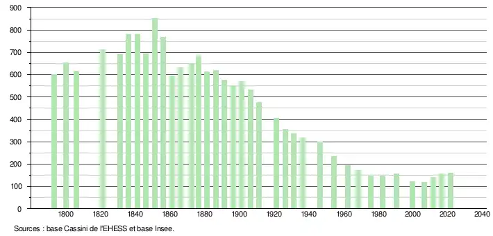 L'évolution du nombre d'habitants est connue à travers les recensements de la population effectués dans la commune depuis 1793. Pour les communes de moins de 10 000 habitants, une enquête de recensement portant sur toute la population est réalisée tous les cinq ans, les populations légales des années intermédiaires étant quant à elles estimées par interpolation ou extrapolation[25]. Pour la commune, le premier recensement exhaustif entrant dans le cadre du nouveau dispositif a été réalisé en 2006[26].