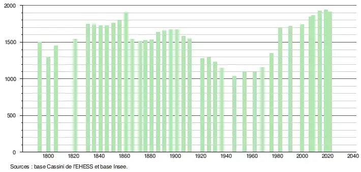L'évolution du nombre d'habitants est connue à travers les recensements de la population effectués dans la commune depuis 1793. Pour les communes de moins de 10 000 habitants, une enquête de recensement portant sur toute la population est réalisée tous les cinq ans, les populations légales des années intermédiaires étant quant à elles estimées par interpolation ou extrapolation[18]. Pour la commune, le premier recensement exhaustif entrant dans le cadre du nouveau dispositif a été réalisé en 2008[19].