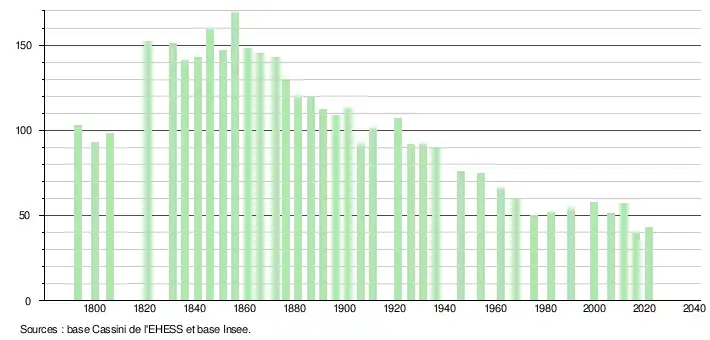L'évolution du nombre d'habitants est connue à travers les recensements de la population effectués dans la commune depuis 1793. Pour les communes de moins de 10 000 habitants, une enquête de recensement portant sur toute la population est réalisée tous les cinq ans, les populations légales des années intermédiaires étant quant à elles estimées par interpolation ou extrapolation[29]. Pour la commune, le premier recensement exhaustif entrant dans le cadre du nouveau dispositif a été réalisé en 2006[30].