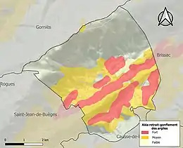 La commune est vulnérable au risque de mouvements de terrains constitué principalement du retrait-gonflement des sols argileux[23]. Cet aléa est susceptible d'engendrer des dommages importants aux bâtiments en cas d’alternance de périodes de sécheresse et de pluie. 49,7 % de la superficie communale est en aléa moyen ou fort (59,3 % au niveau départemental et 48,5 % au niveau national). Sur les 57 bâtiments dénombrés sur la commune en 2019, 46 sont en aléa moyen ou fort, soit 81 %, à comparer aux 85 % au niveau départemental et 54 % au niveau national. Une cartographie de l'exposition du territoire national au retrait gonflement des sols argileux est disponible sur le site du BRGM[24],[Carte 2].
