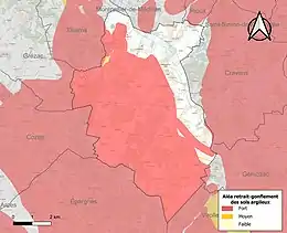 Le retrait-gonflement des sols argileux est susceptible d'engendrer des dommages importants aux bâtiments en cas d’alternance de périodes de sécheresse et de pluie. 75,2 % de la superficie communale est en aléa moyen ou fort (54,2 % au niveau départemental et 48,5 % au niveau national). Sur les 598 bâtiments dénombrés sur la commune en 2019, 255 sont en aléa moyen ou fort, soit 43 %, à comparer aux 57 % au niveau départemental et 54 % au niveau national. Une cartographie de l'exposition du territoire national au retrait gonflement des sols argileux est disponible sur le site du BRGM[14],[Carte 2].