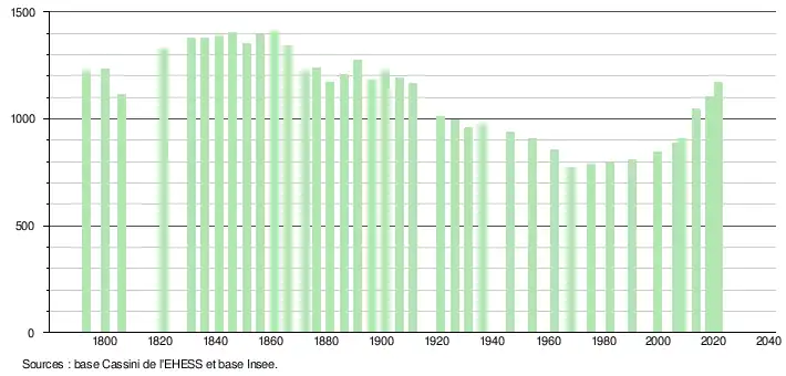 L'évolution du nombre d'habitants est connue à travers les recensements de la population effectués dans la commune depuis 1793. Pour les communes de moins de 10 000 habitants, une enquête de recensement portant sur toute la population est réalisée tous les cinq ans, les populations légales des années intermédiaires étant quant à elles estimées par interpolation ou extrapolation[17]. Pour la commune, le premier recensement exhaustif entrant dans le cadre du nouveau dispositif a été réalisé en 2008[18].