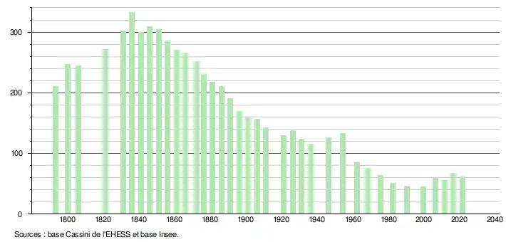 L'évolution du nombre d'habitants est connue à travers les recensements de la population effectués dans la commune depuis 1793. Pour les communes de moins de 10 000 habitants, une enquête de recensement portant sur toute la population est réalisée tous les cinq ans, les populations légales des années intermédiaires étant quant à elles estimées par interpolation ou extrapolation[15]. Pour la commune, le premier recensement exhaustif entrant dans le cadre du nouveau dispositif a été réalisé en 2006[16].