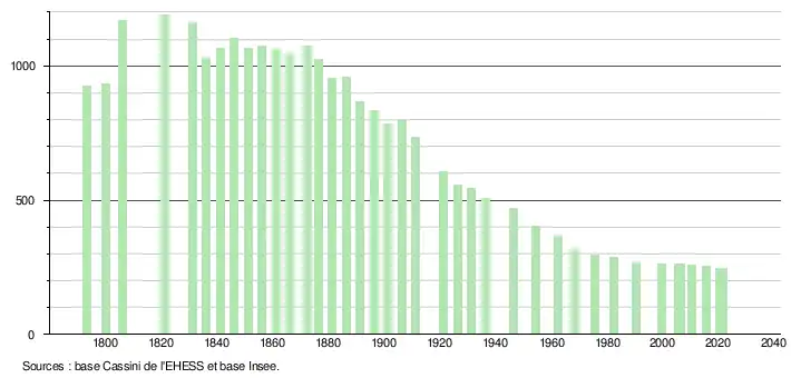 L'évolution du nombre d'habitants est connue à travers les recensements de la population effectués dans la commune depuis 1793. Pour les communes de moins de 10 000 habitants, une enquête de recensement portant sur toute la population est réalisée tous les cinq ans, les populations légales des années intermédiaires étant quant à elles estimées par interpolation ou extrapolation[16]. Pour la commune, le premier recensement exhaustif entrant dans le cadre du nouveau dispositif a été réalisé en 2005[17].