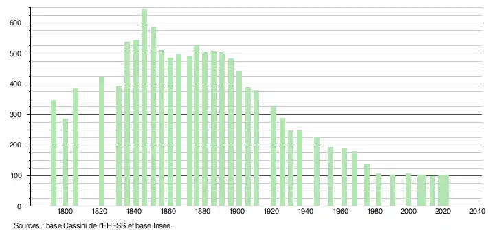 L'évolution du nombre d'habitants est connue à travers les recensements de la population effectués dans la commune depuis 1793. Pour les communes de moins de 10 000 habitants, une enquête de recensement portant sur toute la population est réalisée tous les cinq ans, les populations légales des années intermédiaires étant quant à elles estimées par interpolation ou extrapolation[29]. Pour la commune, le premier recensement exhaustif entrant dans le cadre du nouveau dispositif a été réalisé en 2008[30].