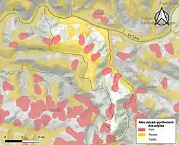 La commune est vulnérable au risque de mouvements de terrains constitué principalement du retrait-gonflement des sols argileux[24]. Cet aléa est susceptible d'engendrer des dommages importants aux bâtiments en cas d’alternance de périodes de sécheresse et de pluie. 50,7 % de la superficie communale est en aléa moyen ou fort (76,3 % au niveau départemental et 48,5 % au niveau national). Sur les 88 bâtiments dénombrés sur la commune en 2019, 44 sont en aléa moyen ou fort, soit 50 %, à comparer aux 90 % au niveau départemental et 54 % au niveau national. Une cartographie de l'exposition du territoire national au retrait gonflement des sols argileux est disponible sur le site du BRGM[25],[Carte 3].