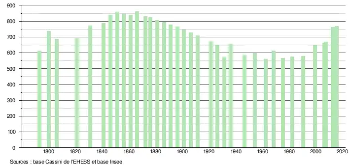 L'évolution du nombre d'habitants est connue à travers les recensements de la population effectués dans la commune depuis 1793. Pour les communes de moins de 10 000 habitants, une enquête de recensement portant sur toute la population est réalisée tous les cinq ans, les populations légales des années intermédiaires étant quant à elles estimées par interpolation ou extrapolation[13]. Pour la commune, le premier recensement exhaustif entrant dans le cadre du nouveau dispositif a été réalisé en 2007[14].