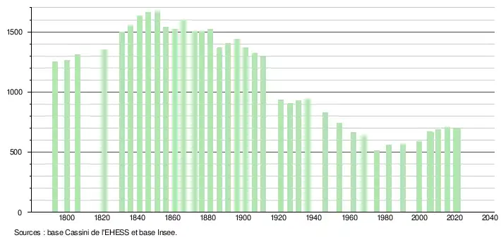 | L'évolution du nombre d'habitants est connue à travers les recensements de la population effectués dans la commune depuis 1793. Pour les communes de moins de 10 000 habitants, une enquête de recensement portant sur toute la population est réalisée tous les cinq ans, les populations légales des années intermédiaires étant quant à elles estimées par interpolation ou extrapolation[22]. Pour la commune, le premier recensement exhaustif entrant dans le cadre du nouveau dispositif a été réalisé en 2005[23]. En 2021, la commune comptait 699 habitants[Note 4], en diminution de 1,13 % par rapport à 2015 (Corrèze : −0,86 %, France hors Mayotte : +1,84 %). |