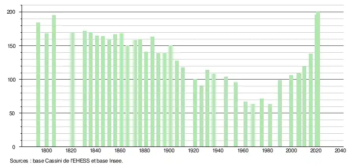 L'évolution du nombre d'habitants est connue à travers les recensements de la population effectués dans la commune depuis 1793. Pour les communes de moins de 10 000 habitants, une enquête de recensement portant sur toute la population est réalisée tous les cinq ans, les populations légales des années intermédiaires étant quant à elles estimées par interpolation ou extrapolation[21]. Pour la commune, le premier recensement exhaustif entrant dans le cadre du nouveau dispositif a été réalisé en 2005[22].