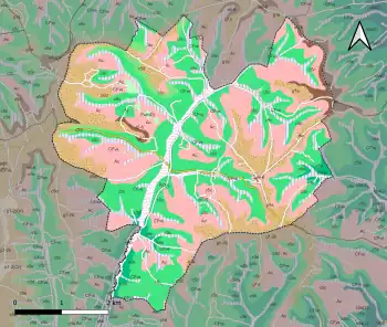 L'occupation des sols de la commune, telle qu'elle ressort de la base de données européenne d’occupation biophysique des sols Corine Land Cover (CLC), est marquée par l'importance des forêts et milieux semi-naturels (56,1 % en 2018), une proportion sensiblement équivalente à celle de 1990 (54,5 %). La répartition détaillée en 2018 est la suivante : forêts (54,8 %), zones agricoles hétérogènes (31,4 %), prairies (12,4 %), milieux à végétation arbustive et/ou herbacée (1,3 %)[32]. L'évolution de l’occupation des sols de la commune et de ses infrastructures peut être observée sur les différentes représentations cartographiques du territoire : la carte de Cassini (XVIIIe siècle), la carte d'état-major (1820-1866) et les cartes ou photos aériennes de l'IGN pour la période actuelle (1950 à aujourd'hui)[Carte 3].