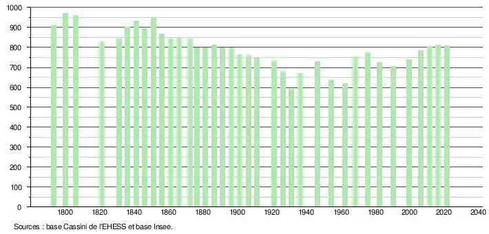L'évolution du nombre d'habitants est connue à travers les recensements de la population effectués dans la commune depuis 1793. Pour les communes de moins de 10 000 habitants, une enquête de recensement portant sur toute la population est réalisée tous les cinq ans, les populations légales des années intermédiaires étant quant à elles estimées par interpolation ou extrapolation[26]. Pour la commune, le premier recensement exhaustif entrant dans le cadre du nouveau dispositif a été réalisé en 2006[27].