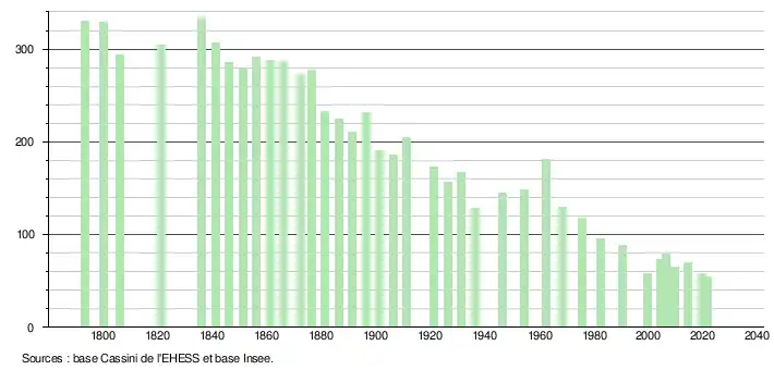 L'évolution du nombre d'habitants est connue à travers les recensements de la population effectués dans la commune depuis 1793. Pour les communes de moins de 10 000 habitants, une enquête de recensement portant sur toute la population est réalisée tous les cinq ans, les populations légales des années intermédiaires étant quant à elles estimées par interpolation ou extrapolation[25]. Pour la commune, le premier recensement exhaustif entrant dans le cadre du nouveau dispositif a été réalisé en 2004[26].