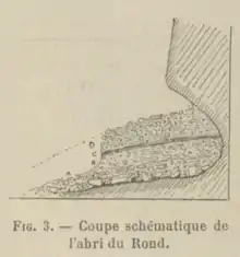 - A : cailloutis, 60 cm d'épaisseur, stérile[32]. - B : cailloutis, 50 cm d'épaisseur, nombreux os d'un grand Bos, d'un grand Equus et des dents d'ours[32]. (Moustérien[33] ?) - C : couche archéologique d'aspect noirâtre et onctueux, très nombreux restes organiques, pierres taillées, éclats de silex et ossements brisés, plusieurs foyers[32]. - D : éboulis[32].