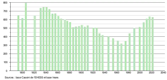 L'évolution du nombre d'habitants est connue à travers les recensements de la population effectués dans la commune depuis 1793. Pour les communes de moins de 10 000 habitants, une enquête de recensement portant sur toute la population est réalisée tous les cinq ans, les populations légales des années intermédiaires étant quant à elles estimées par interpolation ou extrapolation[37]. Pour la commune, le premier recensement exhaustif entrant dans le cadre du nouveau dispositif a été réalisé en 2006[38].