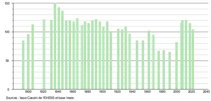 L'évolution du nombre d'habitants est connue à travers les recensements de la population effectués dans la commune depuis 1793. Pour les communes de moins de 10 000 habitants, une enquête de recensement portant sur toute la population est réalisée tous les cinq ans, les populations légales des années intermédiaires étant quant à elles estimées par interpolation ou extrapolation[40]. Pour la commune, le premier recensement exhaustif entrant dans le cadre du nouveau dispositif a été réalisé en 2007[41].