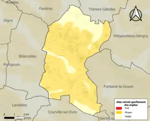 Le retrait-gonflement des sols argileux est susceptible d'engendrer des dommages importants aux bâtiments en cas d’alternance de périodes de sécheresse et de pluie. 77,6 % de la superficie communale est en aléa moyen ou fort (52,8 % au niveau départemental et 48,5 % au niveau national). Sur les 414 bâtiments dénombrés sur la commune en 2019, 413 sont en aléa moyen ou fort, soit 100 %, à comparer aux 70 % au niveau départemental et 54 % au niveau national. Une cartographie de l'exposition du territoire national au retrait gonflement des sols argileux est disponible sur le site du BRGM[16],[Carte 2].