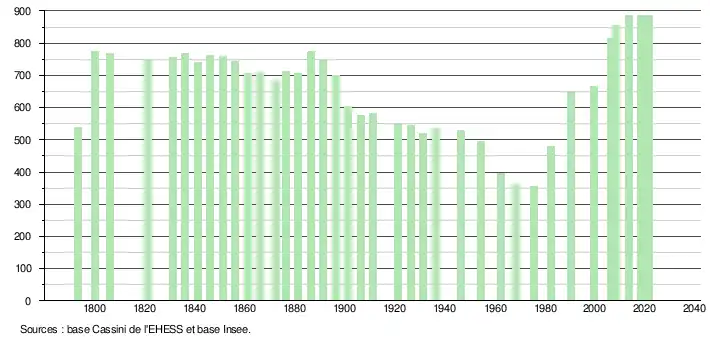 L'évolution du nombre d'habitants est connue à travers les recensements de la population effectués dans la commune depuis 1793. Pour les communes de moins de 10 000 habitants, une enquête de recensement portant sur toute la population est réalisée tous les cinq ans, les populations légales des années intermédiaires étant quant à elles estimées par interpolation ou extrapolation[28]. Pour la commune, le premier recensement exhaustif entrant dans le cadre du nouveau dispositif a été réalisé en 2008[29].