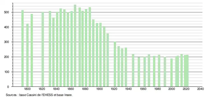 L'évolution du nombre d'habitants est connue à travers les recensements de la population effectués dans la commune depuis 1793. Pour les communes de moins de 10 000 habitants, une enquête de recensement portant sur toute la population est réalisée tous les cinq ans, les populations légales des années intermédiaires étant quant à elles estimées par interpolation ou extrapolation[18]. Pour la commune, le premier recensement exhaustif entrant dans le cadre du nouveau dispositif a été réalisé en 2008[19].