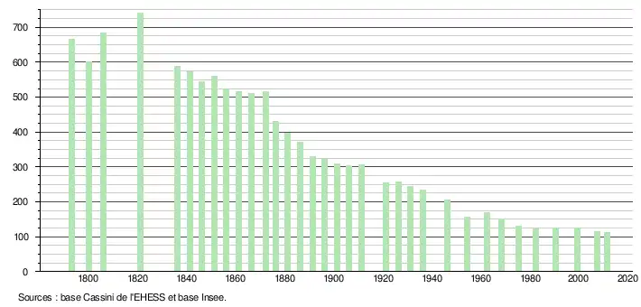 L'évolution du nombre d'habitants est connue à travers les recensements de la population effectués dans la commune depuis 1793. À partir du , les populations légales des communes sont publiées annuellement dans le cadre d'un recensement qui repose désormais sur une collecte d'information annuelle, concernant successivement tous les territoires communaux au cours d'une période de cinq ans. Pour les communes de moins de 10 000 habitants, une enquête de recensement portant sur toute la population est réalisée tous les cinq ans, les populations légales des années intermédiaires étant quant à elles estimées par interpolation ou extrapolation[4]. Pour la commune, le premier recensement exhaustif entrant dans le cadre du nouveau dispositif a été réalisé en 2007[5],[Note 2].