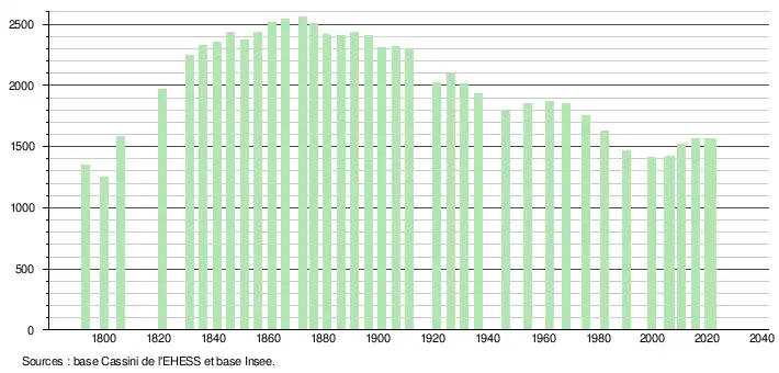 L'évolution du nombre d'habitants est connue à travers les recensements de la population effectués dans la commune depuis 1793. Pour les communes de moins de 10 000 habitants, une enquête de recensement portant sur toute la population est réalisée tous les cinq ans, les populations légales des années intermédiaires étant quant à elles estimées par interpolation ou extrapolation[22]. Pour la commune, le premier recensement exhaustif entrant dans le cadre du nouveau dispositif a été réalisé en 2005[23].