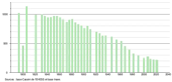 L'évolution du nombre d'habitants est connue à travers les recensements de la population effectués dans la commune depuis 1793. Pour les communes de moins de 10 000 habitants, une enquête de recensement portant sur toute la population est réalisée tous les cinq ans, les populations légales des années intermédiaires étant quant à elles estimées par interpolation ou extrapolation[23]. Pour la commune, le premier recensement exhaustif entrant dans le cadre du nouveau dispositif a été réalisé en 2005[24].