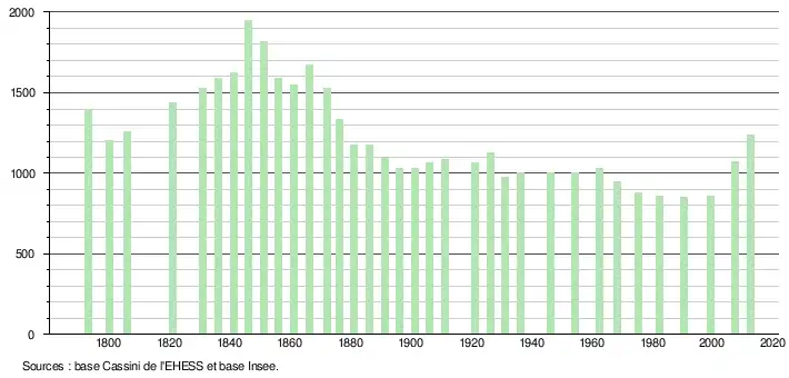 L'évolution du nombre d'habitants est connue à travers les recensements de la population effectués dans la commune depuis 1793. À partir du , les populations légales des communes sont publiées annuellement dans le cadre d'un recensement qui repose désormais sur une collecte d'information annuelle, concernant successivement tous les territoires communaux au cours d'une période de cinq ans. Pour les communes de moins de 10 000 habitants, une enquête de recensement portant sur toute la population est réalisée tous les cinq ans, les populations légales des années intermédiaires étant quant à elles estimées par interpolation ou extrapolation[29]. Pour la commune, le premier recensement exhaustif entrant dans le cadre du nouveau dispositif a été réalisé en 2007[30],[Note 1].