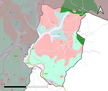 L'occupation des sols de la commune, telle qu'elle ressort de la base de données européenne d’occupation biophysique des sols Corine Land Cover (CLC), est marquée par l'importance des territoires agricoles (65,3 % en 2018), une proportion identique à celle de 1990 (65,3 %). La répartition détaillée en 2018 est la suivante : zones agricoles hétérogènes (62,6 %), forêts (29,6 %), milieux à végétation arbustive et/ou herbacée (5,1 %), prairies (2,7 %)[32]. L'évolution de l’occupation des sols de la commune et de ses infrastructures peut être observée sur les différentes représentations cartographiques du territoire : la carte de Cassini (XVIIIe siècle), la carte d'état-major (1820-1866) et les cartes ou photos aériennes de l'IGN pour la période actuelle (1950 à aujourd'hui)[Carte 3].