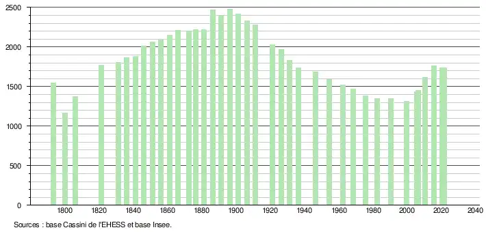 L'évolution du nombre d'habitants est connue à travers les recensements de la population effectués dans la commune depuis 1793. Pour les communes de moins de 10 000 habitants, une enquête de recensement portant sur toute la population est réalisée tous les cinq ans, les populations légales des années intermédiaires étant quant à elles estimées par interpolation ou extrapolation[17]. Pour la commune, le premier recensement exhaustif entrant dans le cadre du nouveau dispositif a été réalisé en 2005[18].