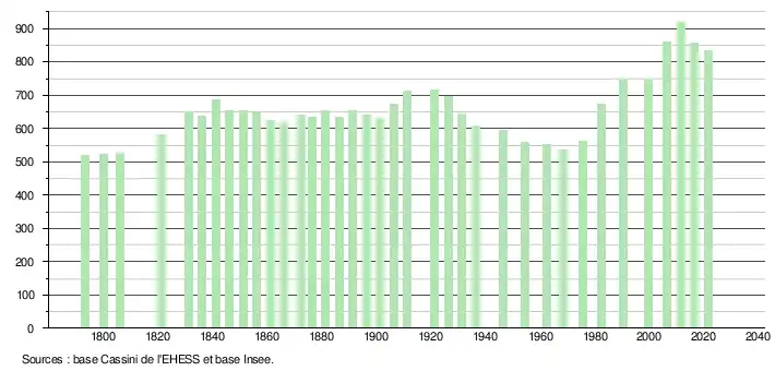 L'évolution du nombre d'habitants est connue à travers les recensements de la population effectués dans la commune depuis 1793. Pour les communes de moins de 10 000 habitants, une enquête de recensement portant sur toute la population est réalisée tous les cinq ans, les populations légales des années intermédiaires étant quant à elles estimées par interpolation ou extrapolation[24]. Pour la commune, le premier recensement exhaustif entrant dans le cadre du nouveau dispositif a été réalisé en 2006[25].