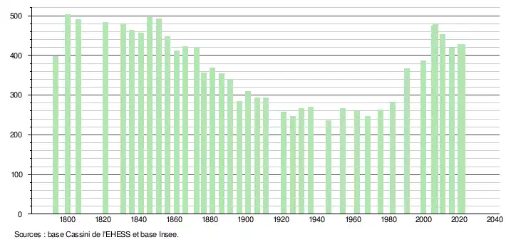 L'évolution du nombre d'habitants est connue à travers les recensements de la population effectués dans la commune depuis 1793. Pour les communes de moins de 10 000 habitants, une enquête de recensement portant sur toute la population est réalisée tous les cinq ans, les populations légales des années intermédiaires étant quant à elles estimées par interpolation ou extrapolation[18]. Pour la commune, le premier recensement exhaustif entrant dans le cadre du nouveau dispositif a été réalisé en 2005[19].