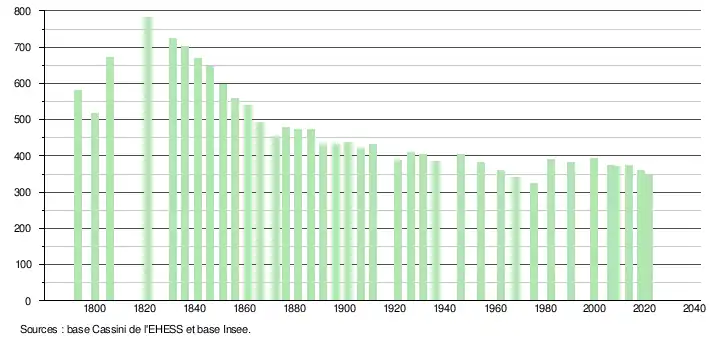 L'évolution du nombre d'habitants est connue à travers les recensements de la population effectués dans la commune depuis 1793. Pour les communes de moins de 10 000 habitants, une enquête de recensement portant sur toute la population est réalisée tous les cinq ans, les populations légales des années intermédiaires étant quant à elles estimées par interpolation ou extrapolation[21]. Pour la commune, le premier recensement exhaustif entrant dans le cadre du nouveau dispositif a été réalisé en 2008[22].