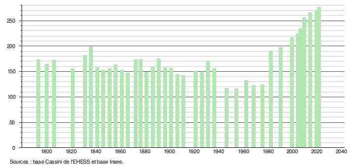 L'évolution du nombre d'habitants est connue à travers les recensements de la population effectués dans la commune depuis 1793. Pour les communes de moins de 10 000 habitants, une enquête de recensement portant sur toute la population est réalisée tous les cinq ans, les populations légales des années intermédiaires étant quant à elles estimées par interpolation ou extrapolation[33]. Pour la commune, le premier recensement exhaustif entrant dans le cadre du nouveau dispositif a été réalisé en 2004[34].