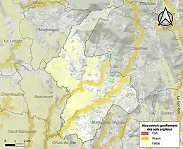 Le retrait-gonflement des sols argileux est susceptible d'engendrer des dommages importants aux bâtiments en cas d’alternance de périodes de sécheresse et de pluie. 12,4 % de la superficie communale est en aléa moyen ou fort (26,8 % au niveau départemental et 48,5 % au niveau national). Sur les 378 bâtiments dénombrés sur la commune en 2019, 13 sont en aléa moyen ou fort, soit 3 %, à comparer aux 36 % au niveau départemental et 54 % au niveau national. Une cartographie de l'exposition du territoire national au retrait gonflement des sols argileux est disponible sur le site du BRGM[16],[Carte 2].