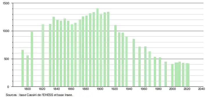| L'évolution du nombre d'habitants est connue à travers les recensements de la population effectués dans la commune depuis 1793. Pour les communes de moins de 10 000 habitants, une enquête de recensement portant sur toute la population est réalisée tous les cinq ans, les populations légales des années intermédiaires étant quant à elles estimées par interpolation ou extrapolation[27]. Pour la commune, le premier recensement exhaustif entrant dans le cadre du nouveau dispositif a été réalisé en 2004[28]. En 2021, la commune comptait 417 habitants[Note 4], en diminution de 2,34 % par rapport à 2015 (Corrèze : −0,86 %, France hors Mayotte : +1,84 %). |