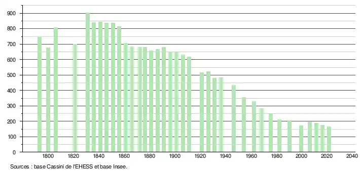 L'évolution du nombre d'habitants est connue à travers les recensements de la population effectués dans la commune depuis 1793. Pour les communes de moins de 10 000 habitants, une enquête de recensement portant sur toute la population est réalisée tous les cinq ans, les populations légales des années intermédiaires étant quant à elles estimées par interpolation ou extrapolation[19]. Pour la commune, le premier recensement exhaustif entrant dans le cadre du nouveau dispositif a été réalisé en 2006[20].