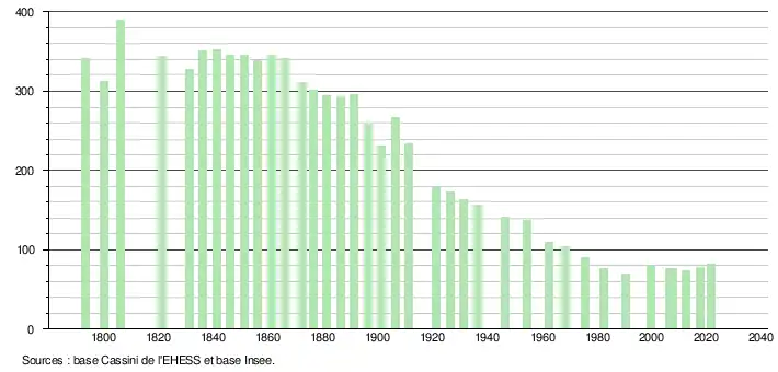 L'évolution du nombre d'habitants est connue à travers les recensements de la population effectués dans la commune depuis 1793. Pour les communes de moins de 10 000 habitants, une enquête de recensement portant sur toute la population est réalisée tous les cinq ans, les populations légales des années intermédiaires étant quant à elles estimées par interpolation ou extrapolation[19]. Pour la commune, le premier recensement exhaustif entrant dans le cadre du nouveau dispositif a été réalisé en 2007[20].