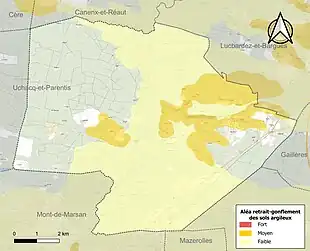 Le retrait-gonflement des sols argileux est susceptible d'engendrer des dommages importants aux bâtiments en cas d’alternance de périodes de sécheresse et de pluie. 13,5 % de la superficie communale est en aléa moyen ou fort (19,2 % au niveau départemental et 48,5 % au niveau national). Sur les 302 bâtiments dénombrés sur la commune en 2019, 58 sont en aléa moyen ou fort, soit 19 %, à comparer aux 17 % au niveau départemental et 54 % au niveau national. Une cartographie de l'exposition du territoire national au retrait gonflement des sols argileux est disponible sur le site du BRGM[21],[22].