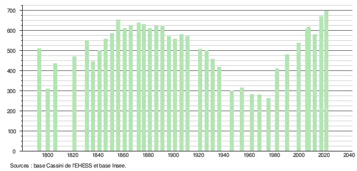 | L'évolution du nombre d'habitants est connue à travers les recensements de la population effectués dans la commune depuis 1793. Pour les communes de moins de 10 000 habitants, une enquête de recensement portant sur toute la population est réalisée tous les cinq ans, les populations légales des années intermédiaires étant quant à elles estimées par interpolation ou extrapolation[27]. Pour la commune, le premier recensement exhaustif entrant dans le cadre du nouveau dispositif a été réalisé en 2007[28]. En 2021, la commune comptait 698 habitants[Note 3], en augmentation de 14,61 % par rapport à 2015 (Landes : +4,9 %, France hors Mayotte : +1,84 %). |