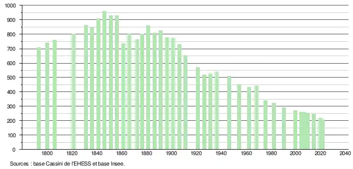 L'évolution du nombre d'habitants est connue à travers les recensements de la population effectués dans la commune depuis 1793. Pour les communes de moins de 10 000 habitants, une enquête de recensement portant sur toute la population est réalisée tous les cinq ans, les populations légales des années intermédiaires étant quant à elles estimées par interpolation ou extrapolation[24]. Pour la commune, le premier recensement exhaustif entrant dans le cadre du nouveau dispositif a été réalisé en 2004[25].