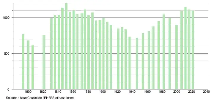 L'évolution du nombre d'habitants est connue à travers les recensements de la population effectués dans la commune depuis 1793. Pour les communes de moins de 10 000 habitants, une enquête de recensement portant sur toute la population est réalisée tous les cinq ans, les populations légales des années intermédiaires étant quant à elles estimées par interpolation ou extrapolation[28]. Pour la commune, le premier recensement exhaustif entrant dans le cadre du nouveau dispositif a été réalisé en 2006[29].