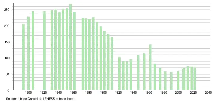 L'évolution du nombre d'habitants est connue à travers les recensements de la population effectués dans la commune depuis 1793. Pour les communes de moins de 10 000 habitants, une enquête de recensement portant sur toute la population est réalisée tous les cinq ans, les populations légales des années intermédiaires étant quant à elles estimées par interpolation ou extrapolation[25]. Pour la commune, le premier recensement exhaustif entrant dans le cadre du nouveau dispositif a été réalisé en 2007[26].