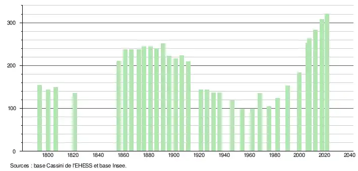 L'évolution du nombre d'habitants est connue à travers les recensements de la population effectués dans la commune depuis 1793. Pour les communes de moins de 10 000 habitants, une enquête de recensement portant sur toute la population est réalisée tous les cinq ans, les populations légales des années intermédiaires étant quant à elles estimées par interpolation ou extrapolation[18]. Pour la commune, le premier recensement exhaustif entrant dans le cadre du nouveau dispositif a été réalisé en 2007[19].