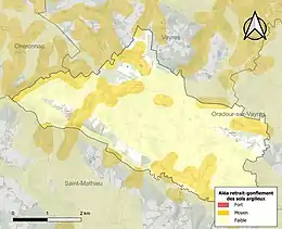 Le retrait-gonflement des sols argileux est susceptible d'engendrer des dommages importants aux bâtiments en cas d’alternance de périodes de sécheresse et de pluie[17]. 26,4 % de la superficie communale est en aléa moyen ou fort (27 % au niveau départemental et 48,5 % au niveau national métropolitain)[Carte 2]. Depuis le , en application de la loi ÉLAN, différentes contraintes s'imposent aux vendeurs, maîtres d'ouvrages ou constructeurs de biens situés dans une zone classée en aléa moyen ou fort[Note 2],[18].